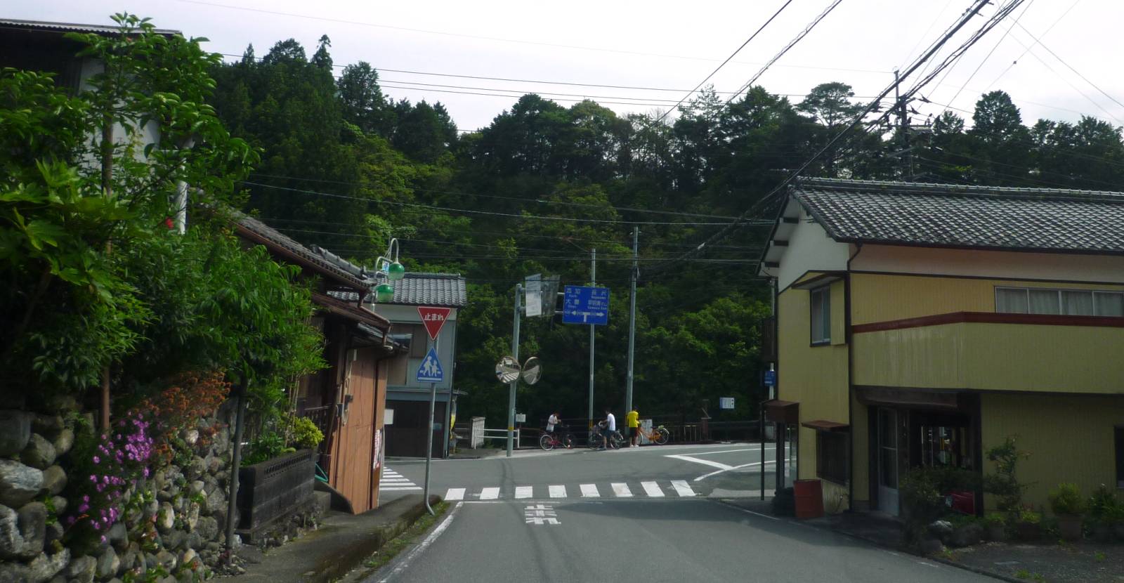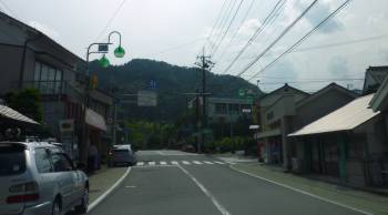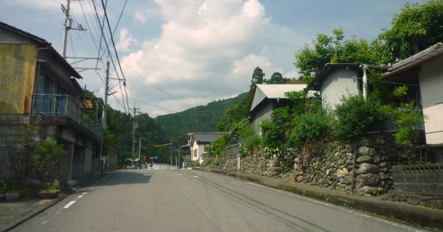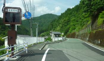 ![]() 県道263号からの分岐 (撮影 2015. 6. 1) 県道263号を吉野橋方向に見る 橋の手前を右に県道264号が分岐する |