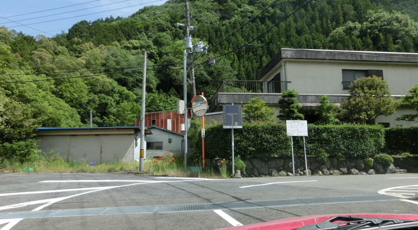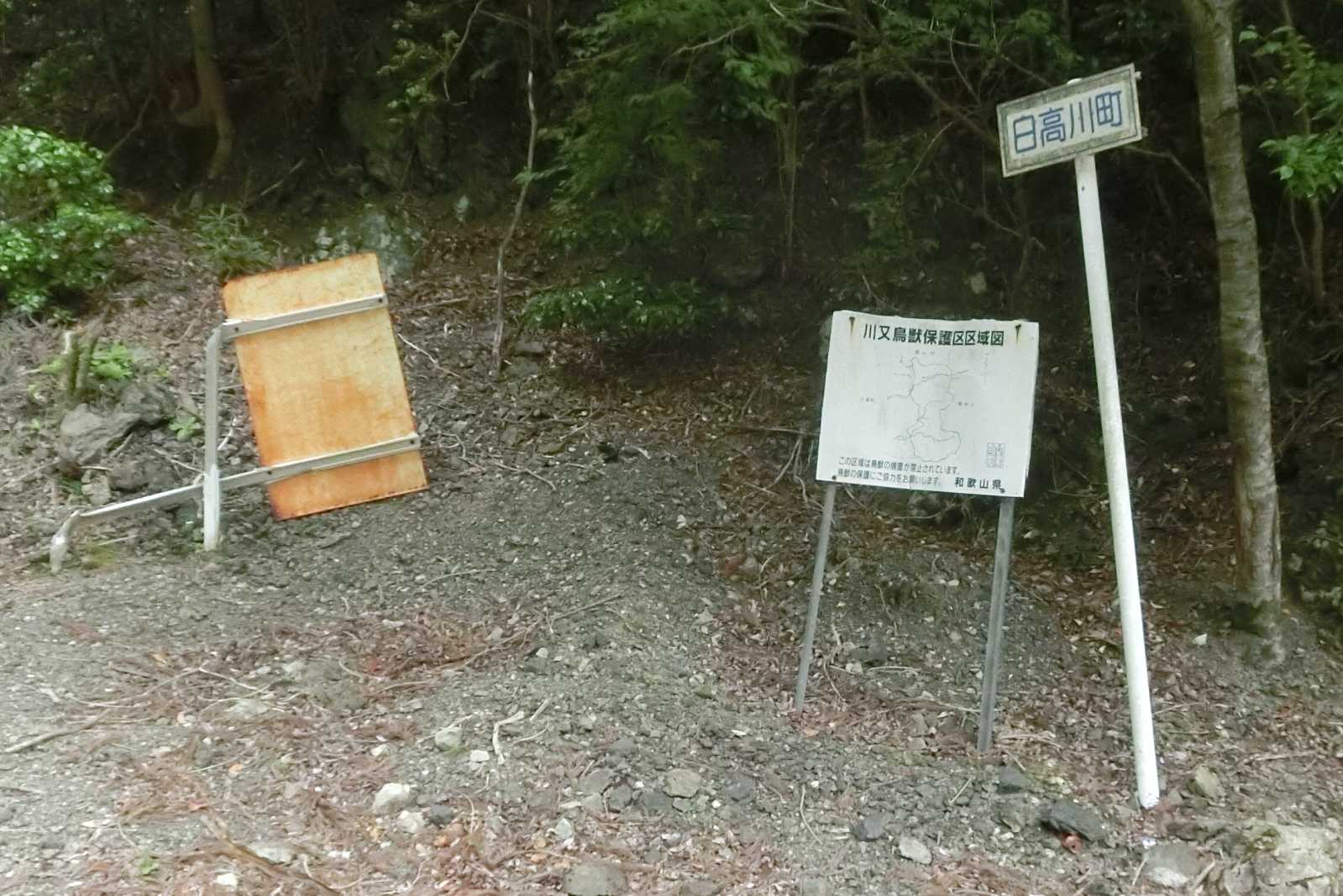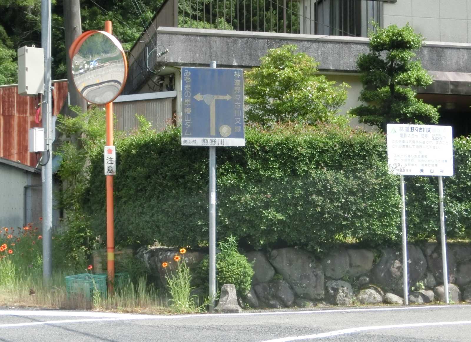 看板の一つは道路標識で、正(まさ)しく丁字路を表していた。左は国道424号を「みやまの里・椿山ダム」へ、右は「林道野々古川又線」となっている。現住所も古く、日高川町になる前の「美山村 熊野川」とあった。