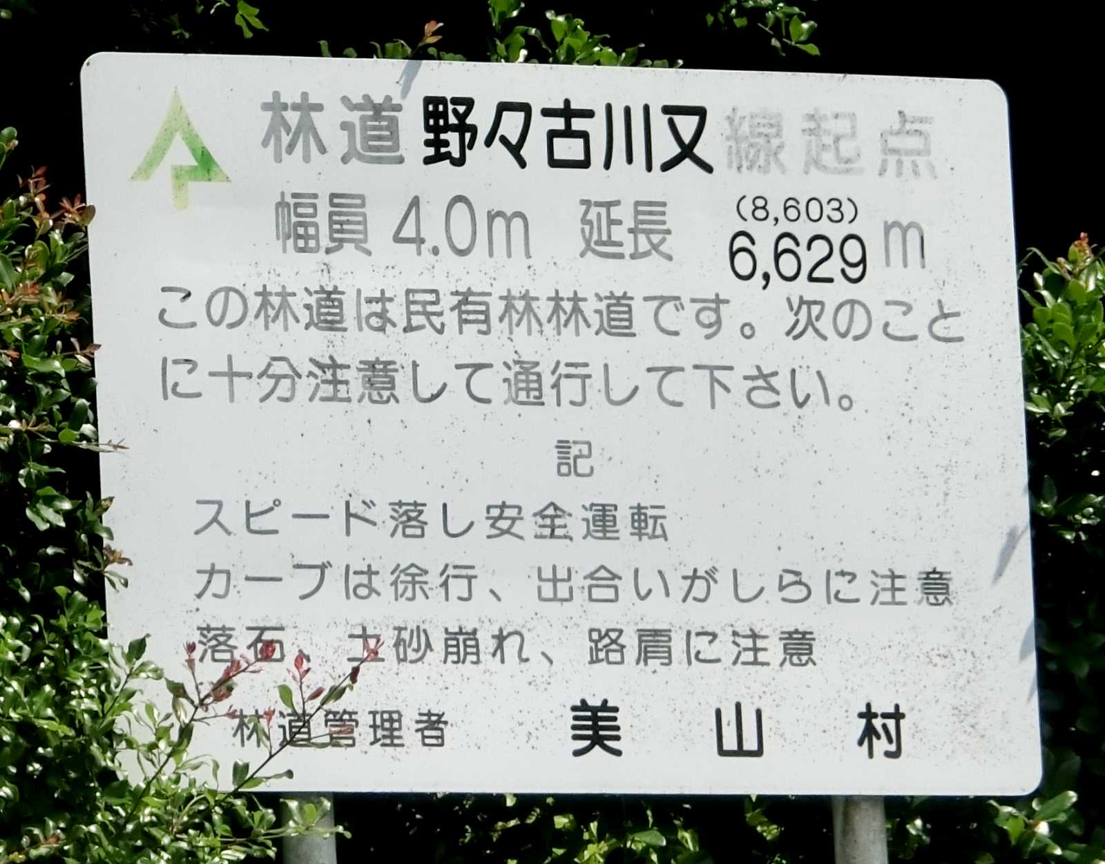 ちょっと気になるのは、林道看板の「野々古川又」の文字や他にも延長の数値、林道管理者が書き換えられていることだ。区間とその林道名などに変更があったようだ(後述)。