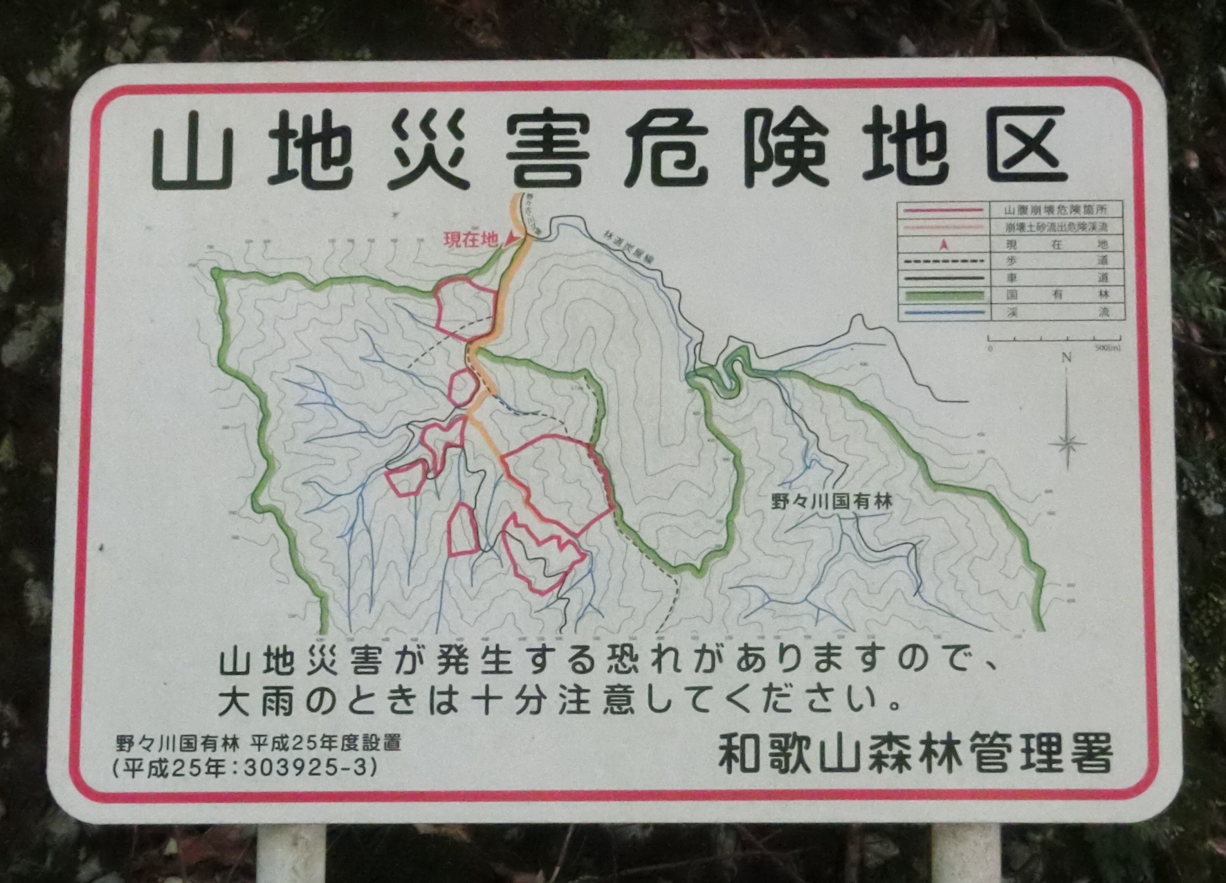 鳥獣保護区の看板とは官林橋を挟んで対角上に「山地災害危険地区」と題した看板が立つ。