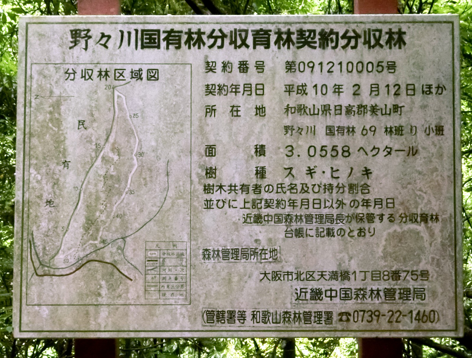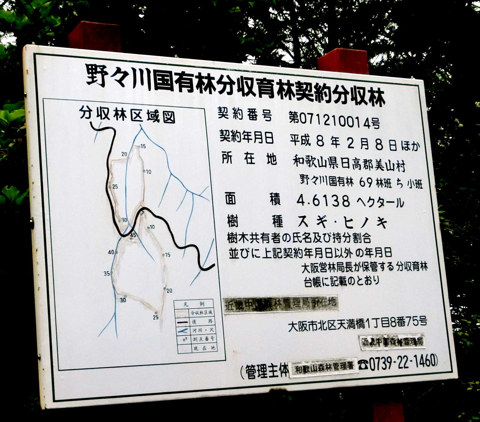 これといって注目すべき内容はなかったが、「林道野々古川又線」という林道名は見られた。この峠道については「野々古川線」という名称もあり、事情はあまりはっきりしない。野々古川又線と言った場合、日高川町側の区間のみを指すと思っていたが、看板の区域図では印南町側にその名がある。
