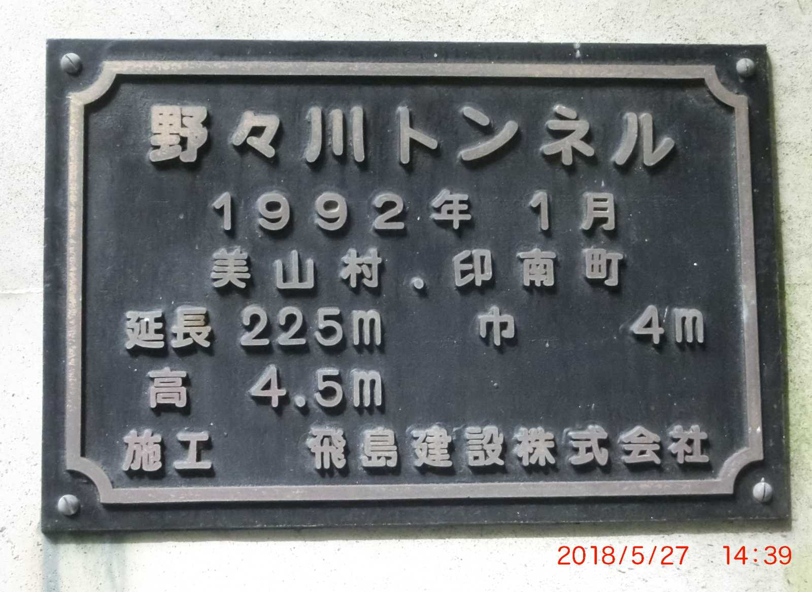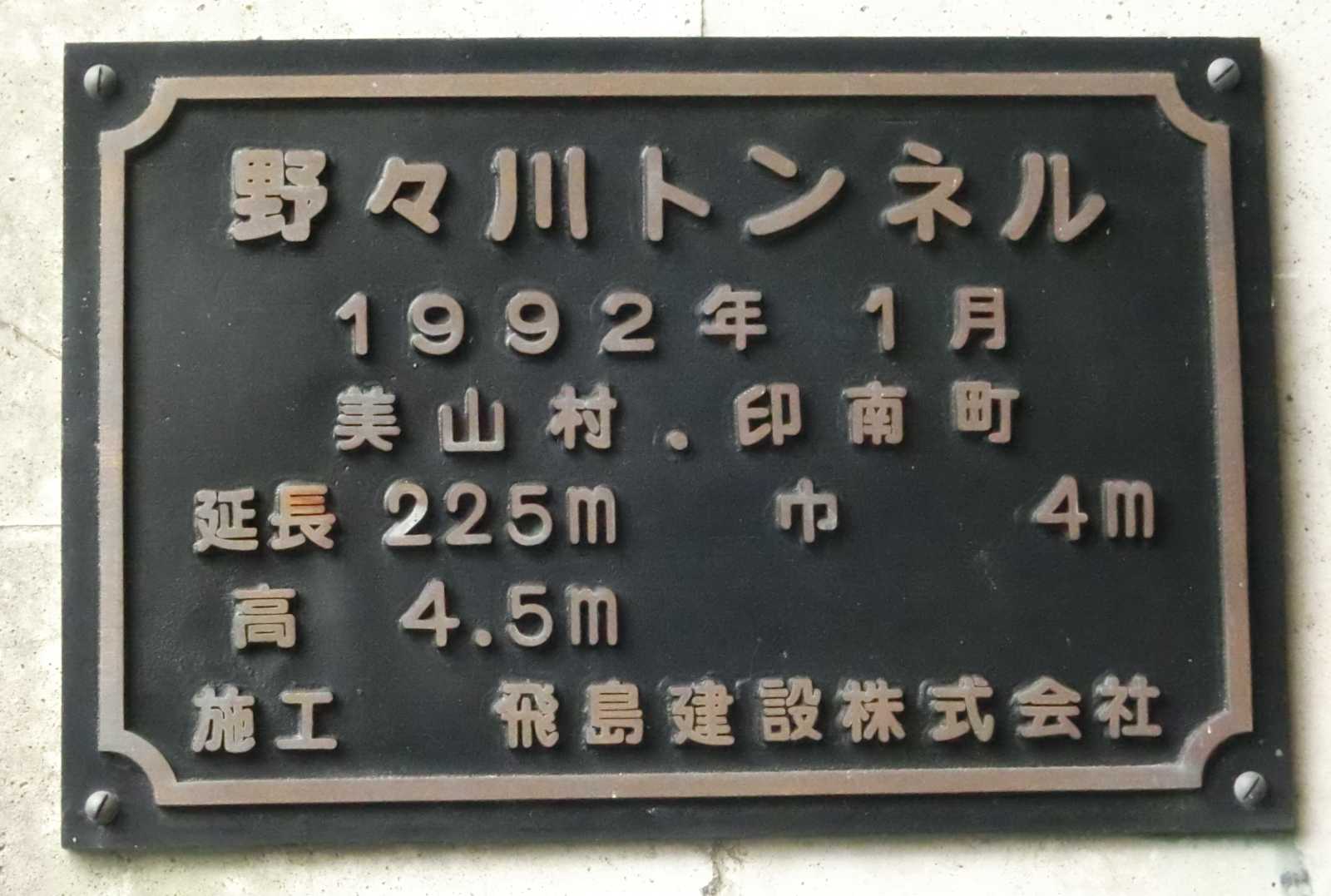 元々峠道全線を野々古川線と呼び、後に美山村(現日高川町)側を美山村の管理として野々古・川又線と改名したと想像していた。その林道の終点がどうも印南町側にあるようだ。すると、野々古・川又線はまるまる野々川隧道を含んでいることになる。扁額の文字はどちらも美山村長によるものか。