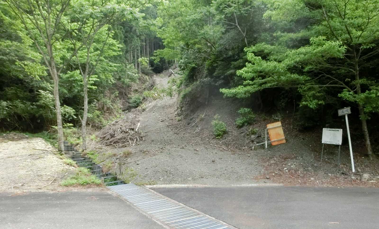 野々川隧道の印南町側坑口周辺は日高川町側とは異なり手狭である。アスファルト路面がちょっと広がっている程度だ。視界もほとんど期待できない。山の斜面と擁壁に囲まれ、閉ざされた空間だ。