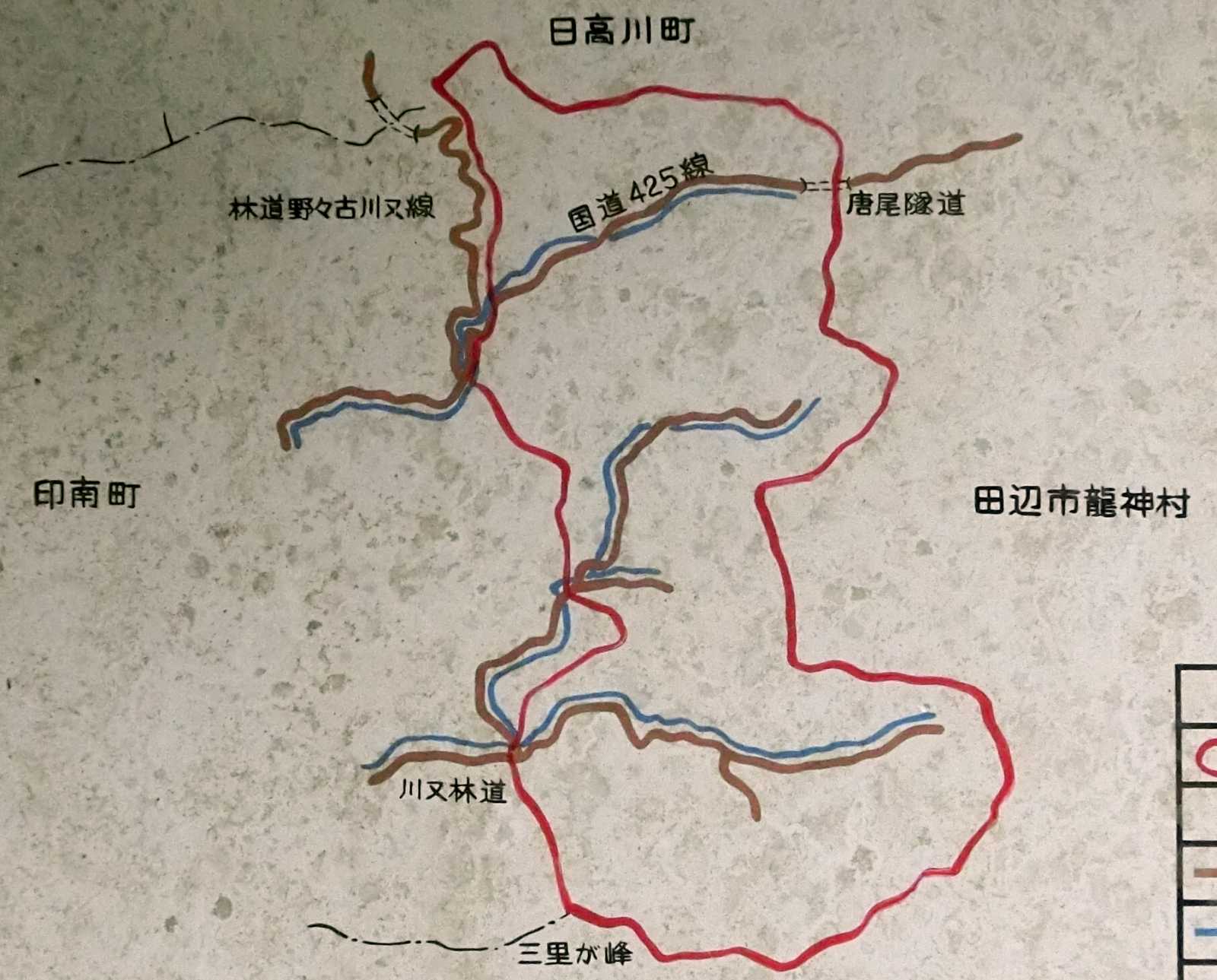 それらからしても、やはり「野々古川又線」という名は日高川町側のみの区間を指す林道名とも思われる。印南町側にはまた別の名がある可能性があるが、不明である。