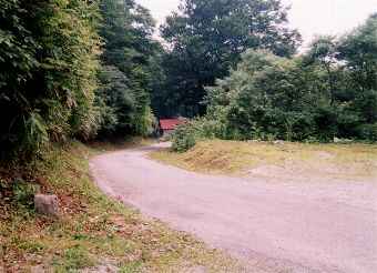 峠の上平側 赤い屋根の小屋が見える 道の左脇にはブナオ峠と書かれた背の低い石柱が 土に埋まるように立つ |