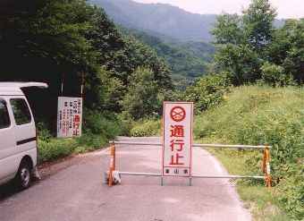 上平村側の入り口を入って直ぐの所 今はゲートが開いている 道路の右側に通行止の看板 災害のため この先 通行止 区間 中河内〜ブナオ峠 期間 平成13年6月15日〜 平成14年5月31日 |