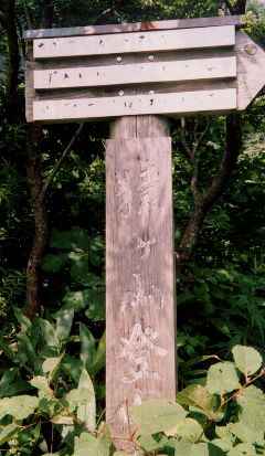 峠より南西へ大門山への登山道が始まる 大門山2.7Km 大門以外には赤摩木古(あかまっこ)、見越、奈良、 大笠などの山名を書いた標柱が見受けられる |