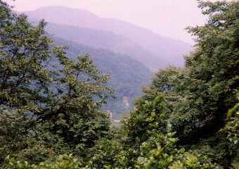 峠道は最初の内、道が通る谷筋の前方に峰が見えている。その峰のどこかが峠なのだろうと思うが、はっきりした鞍部が確認できる訳ではない。 ある程度進んでいよいよその峰に近付いたと思うと、道は一向に峰に取り付こうとしないので怪訝に感じる。壁の様に立ちはだかる峰を前に、道は南の方へとそれていくのだ。これでは峠がどこにあるのかさっぱり見当がつかない。 |
