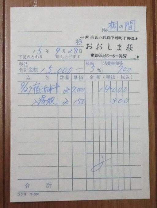 宿泊代は予定通り1泊2食付きで7,000円。消費税(当時は5%)と入湯税(150円/人)を含めても一人7,500円で天下の下部温泉に泊まれたのだった。