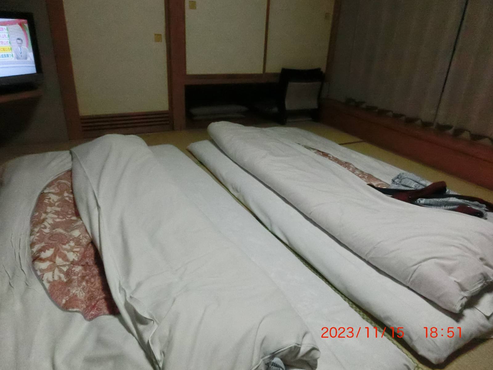 案内パンフレットを見ながら飲泉所なども見学し、かれこれ1時間余りも散策してから宿に戻った。目論見通り、部屋には二組の布団が敷かれていた。 |