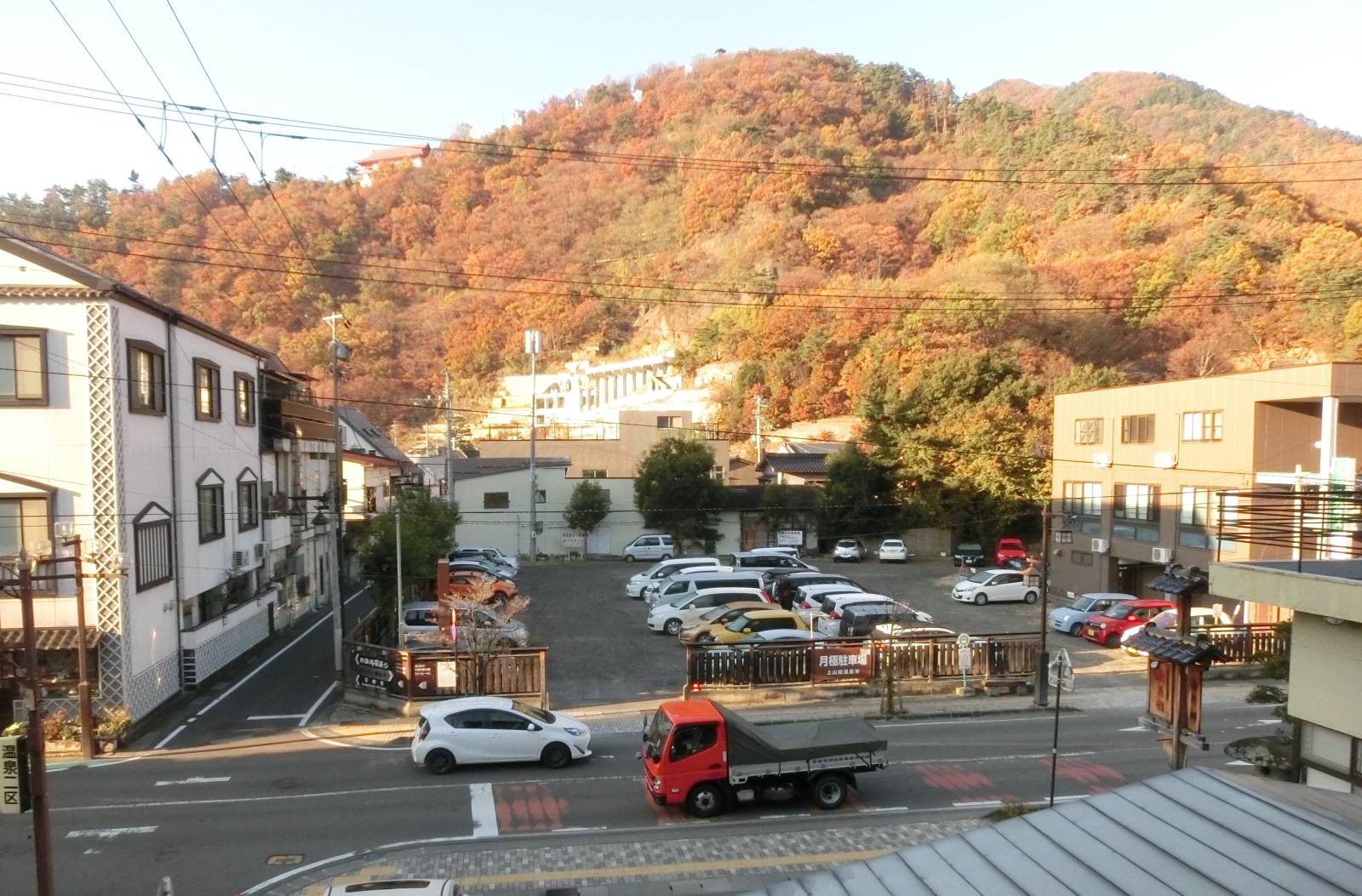 途中、善光寺大本願別院という神社の脇を通り過ぎる。そこから温泉街が望める。丁度温泉看板の温泉マークの箇所である。以前来た時はここで写真を撮った。 |