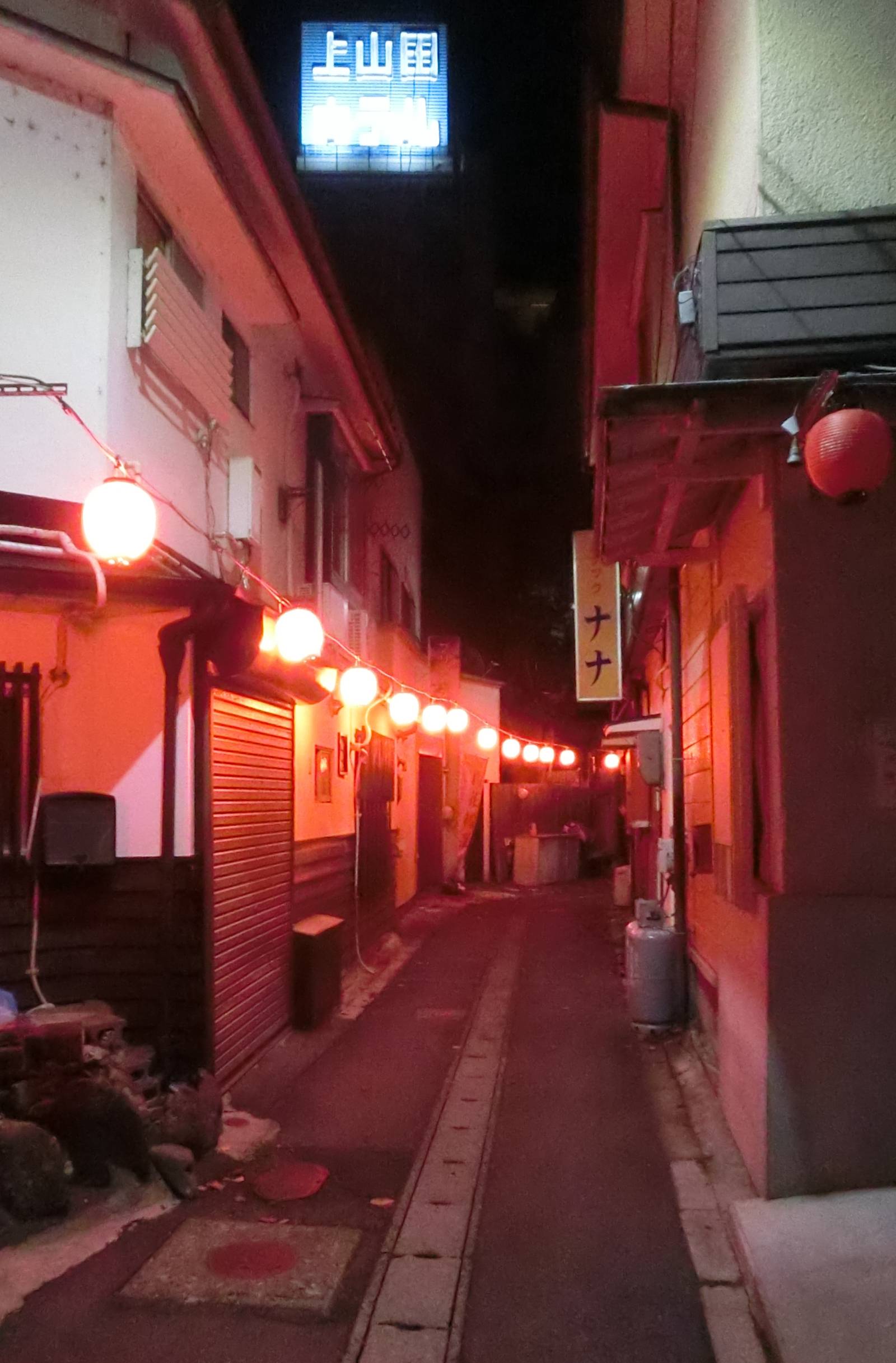 夜の温泉街の迷路のように入り組んだ路地を当てどなくフラフラ歩いていると、何やら怪しい雰囲気になって来た。毒々しい真っ赤な提灯があちこちで灯りだしたのだ。