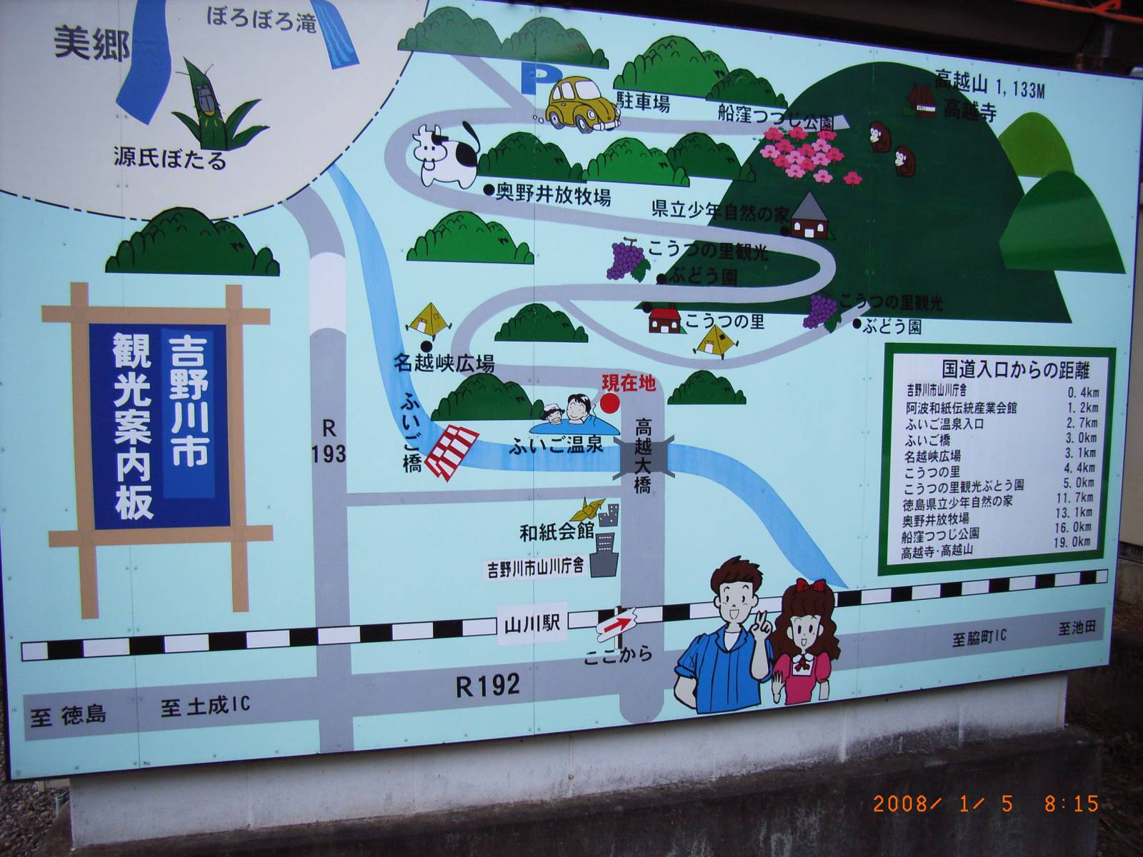 山川町時代の案内図にはまだ高越大橋がない。全体的に古そうな看板で、昔からあったものだろう。新しい方も「吉野川市」とは書かれているが、案内されている範囲は旧山川町の地域だけである。