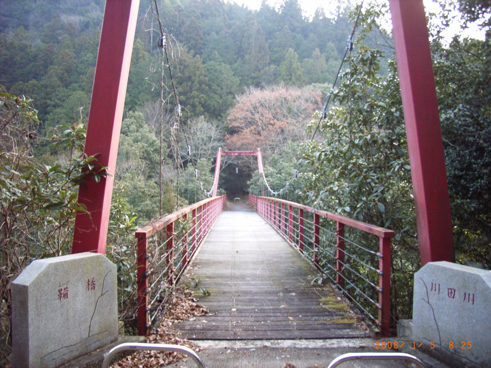 現在、川田川沿いに通じる国道193号は遠く山川トンネルを抜けているが、古くは川田川右岸にピッタリ沿って通じていたものと思う。鞴橋を渡って段丘崖を少し登ると、国道の旧ルートに出られる。 |