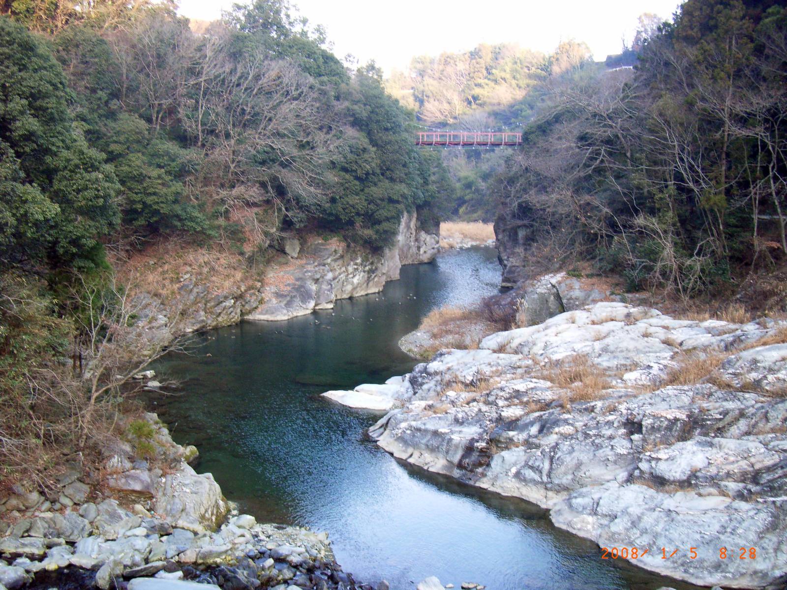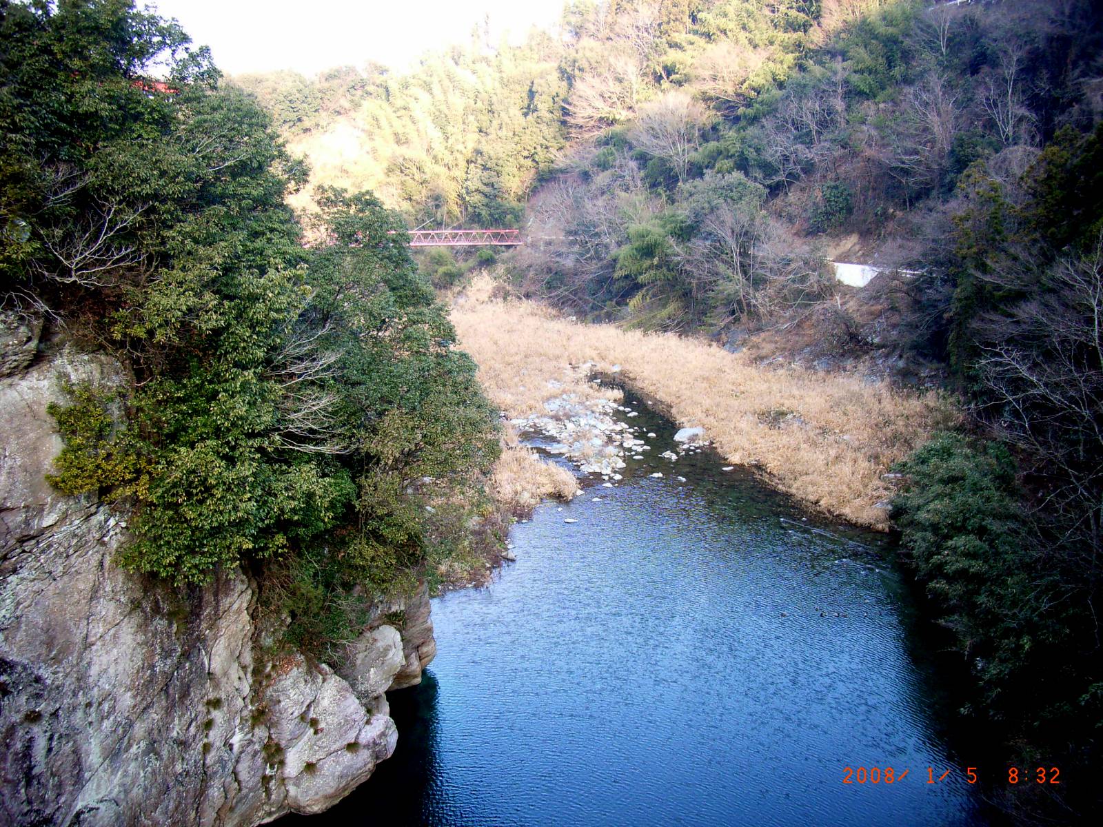 鞴橋は今でも現役で歩いて渡れる。橋の上から名越峡が一望できる。 |