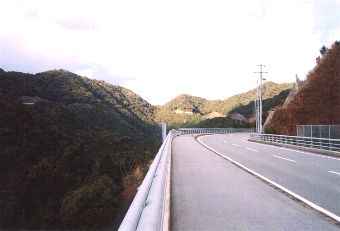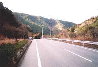 | 錦峠を過ぎるとそれから以降、旧道と新道は大きな谷を挟んで左右別々のコースを辿っていた。新道は錦望トンネルを抜けた後、谷の左岸を快適な2車線路で下っていく。新道から右手を望めば、谷の反対側に旧道のガードレースが林の間から時折顔をのぞかせている。あれが10年前に苦労して通った道なのか。 |