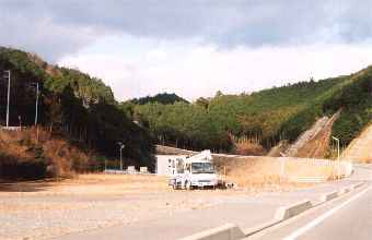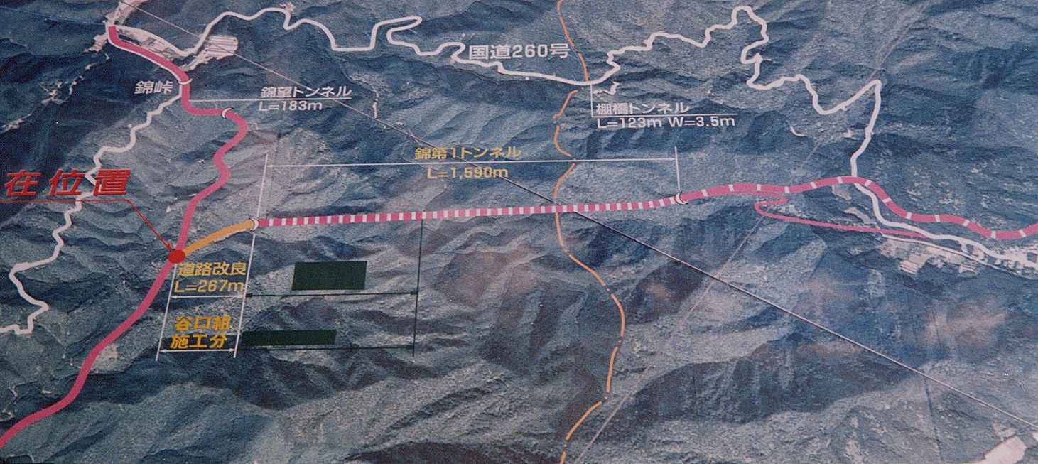 | 新道をそのまま暫し下ると、左に道が分岐する。現在は工事関係者以外、通行禁止である。これが例の南島町へ抜ける建築中の新トンネルへの道である。看板によると「錦第1トンネル」という素っ気無い名である。(第2トンネルはどこに造るのかは分からない)
