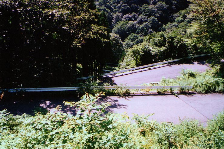 | 峠を日光市細尾へ下る。木に遮られ、眺めがのよいポイントは少ない。また路面状況は良いのだが道幅がぐっと狭くなる。きついカーブも多く、足尾側より走り難い。ヘアピンカーブの連続のつづら折れが待っていた。下を覗くと幾重にも道が重なっている。車ではつづら折れは仕方がないが、散策で歩くのではいやになるだろう。ツーリングのバイクが数台追いついて来た。この様な道では断然バイクの方が早い。脇に寄って追い越させる。このバイク以外に出くわした車輌は他になかった。 |